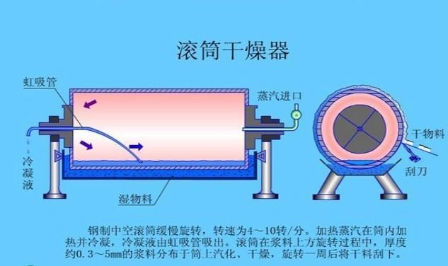 ◎ 干燥时间短。物料的干燥周期一般只有10-300秒,适用于热敏性物料。若将滚筒干燥机设置在真空环境中,则可在减压条件下运行。